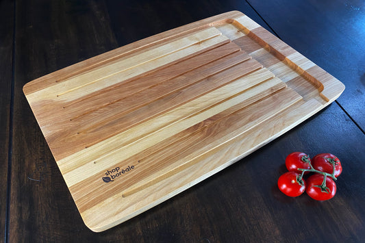 Nous proposons également des planches à découper en bois classiques avec gouttière, idéales pour couper fruits, légumes ou viandes juteuses. Elles permettent un travail propre et organisé pour votre cuisine quotidienne.